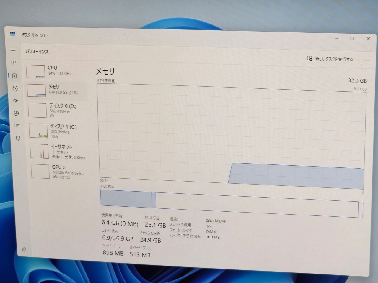 ストレージ:NVMe SSD 512GB(Cドライブ)+ NVMe SSD 1TB(Dドライブ)
