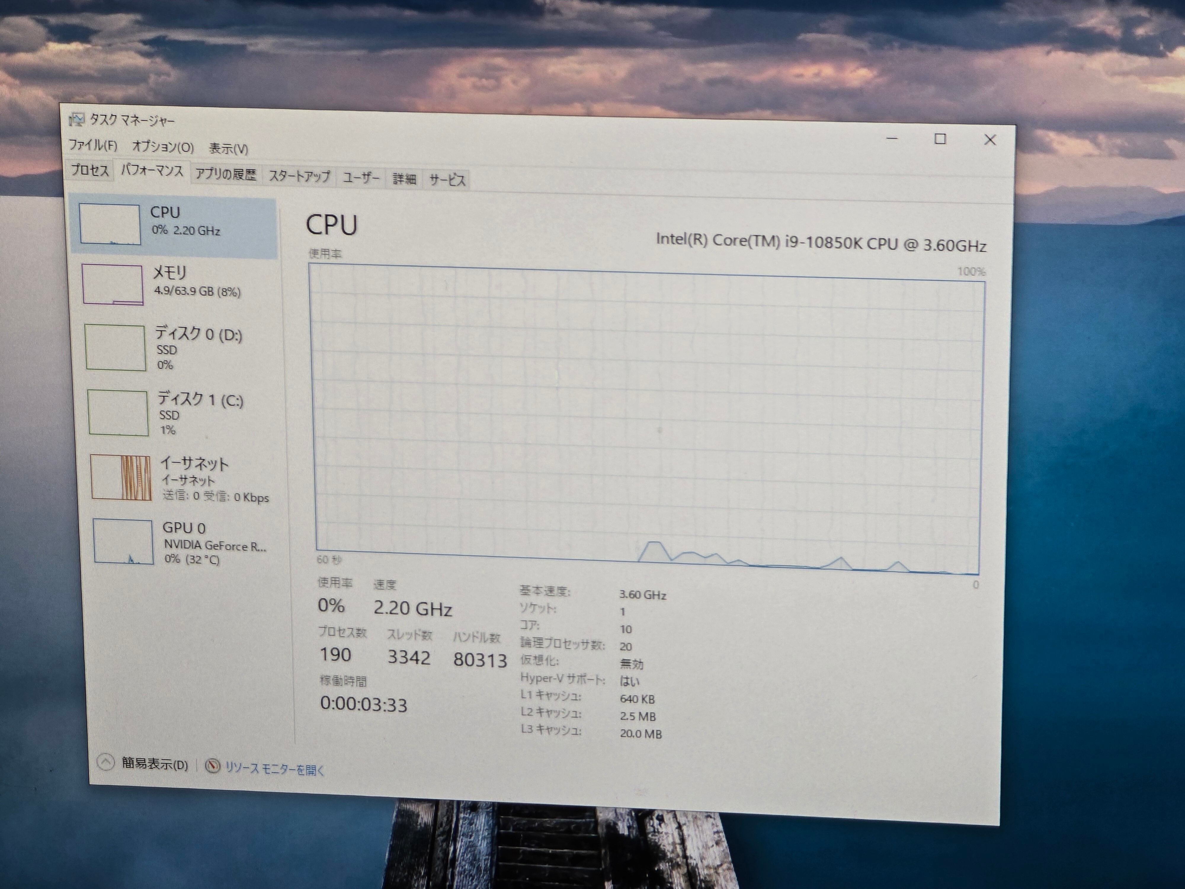 CPU:Intel Core i9-10850K(10コア20スレッド / 最大5.2GHz)