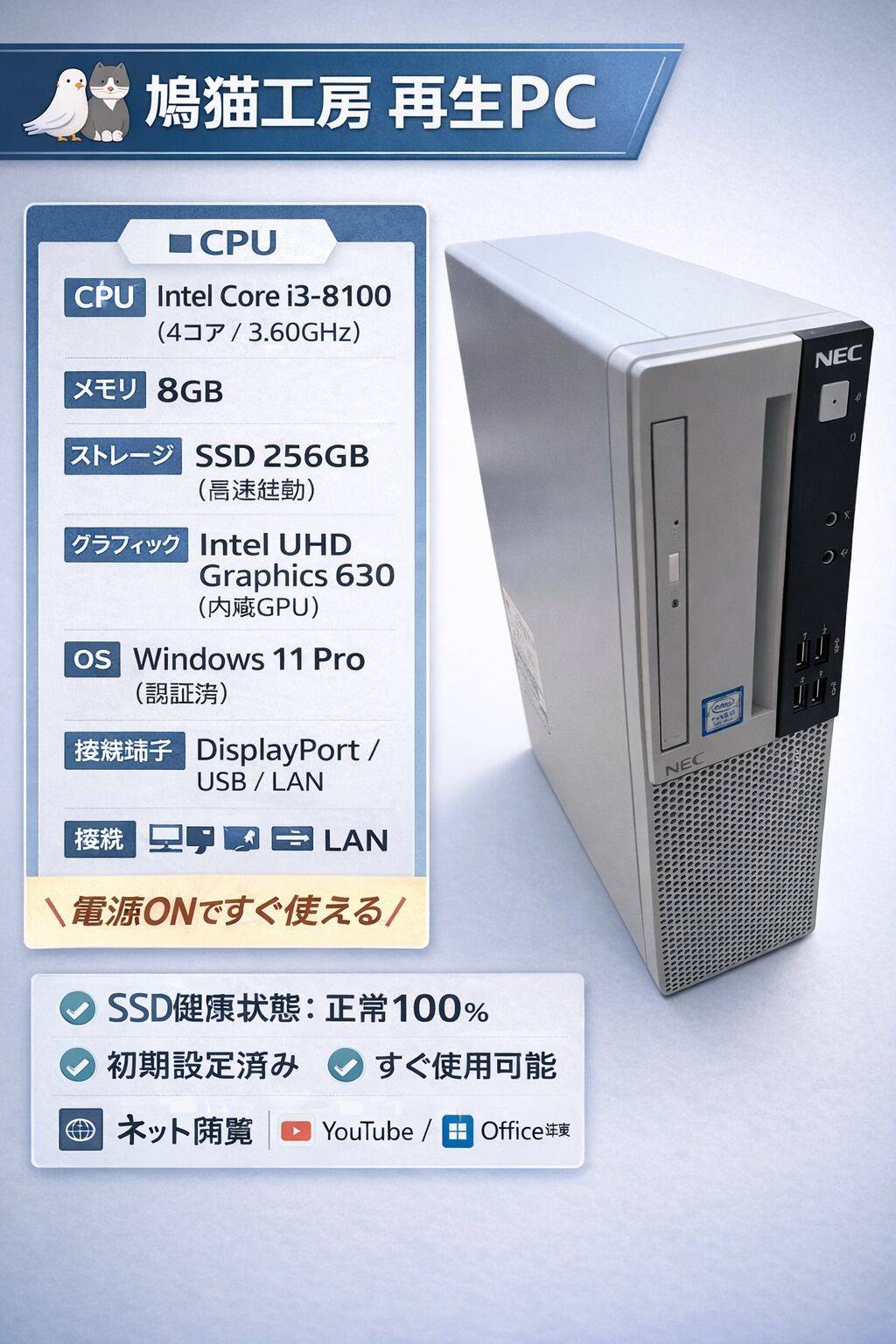 【Windows11対応】NEC i3-8100|SSD256GB|事務・在宅ワーク用PC