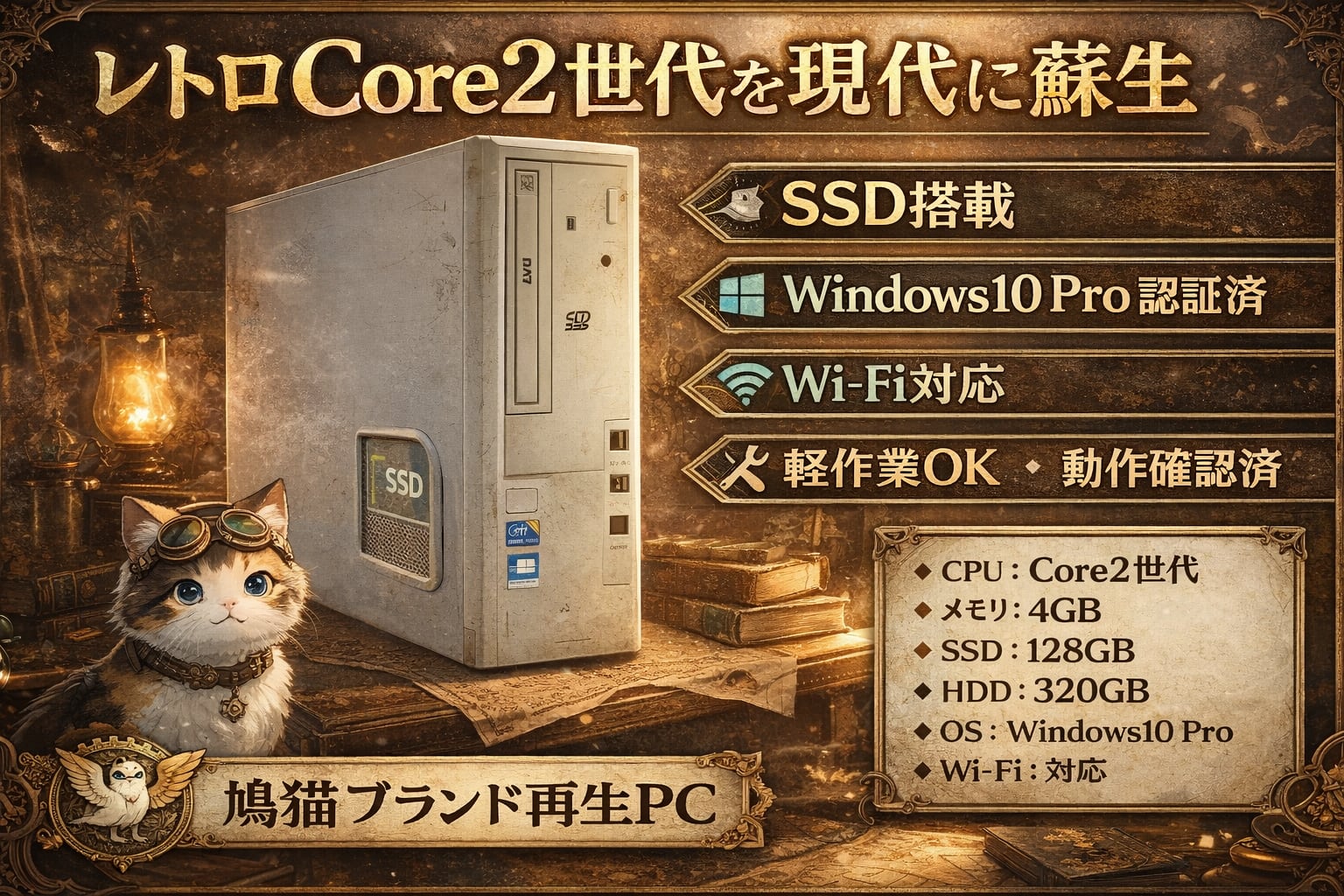 鳩猫工房 再生デスクトップPC|Core2 Duo E7500|SSD128GB+HDD320GB|Wi-Fi対応|Windows10認証済|起動時F1必要(訳あり)