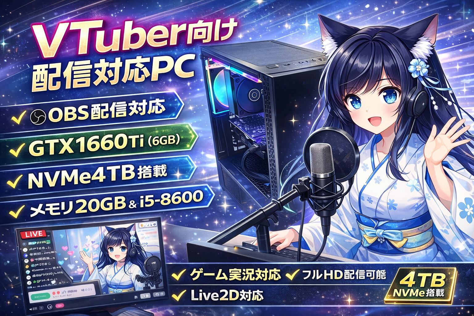 鳩猫工房 再生ゲーミングPC i5-8600 メモリ20GB GTX1660Ti NVMe4TB+SSD640GB+128GB VTuber配信対応 Windows11認証済