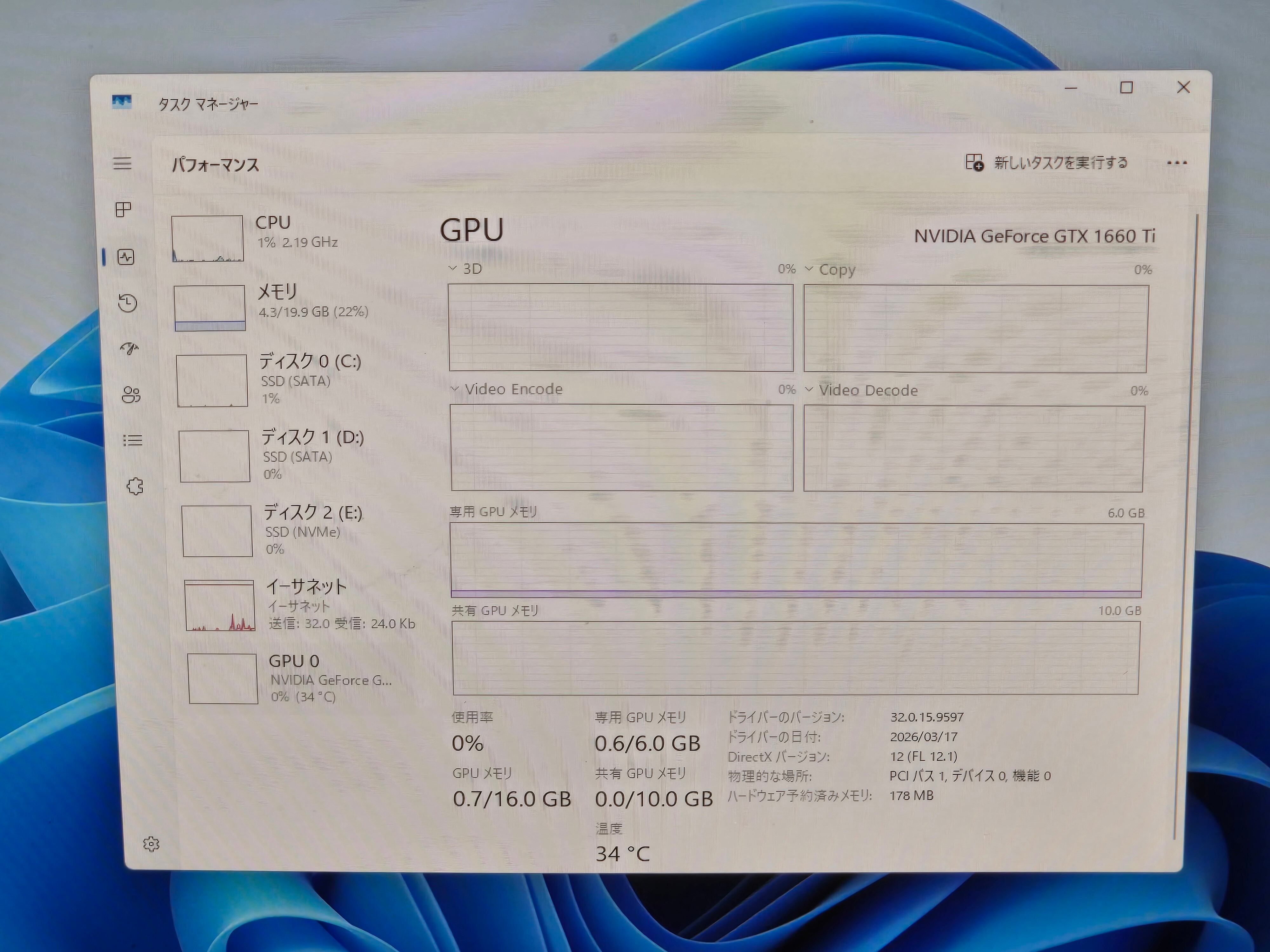 GPU:NVIDIA GeForce GTX1660Ti(6GB)