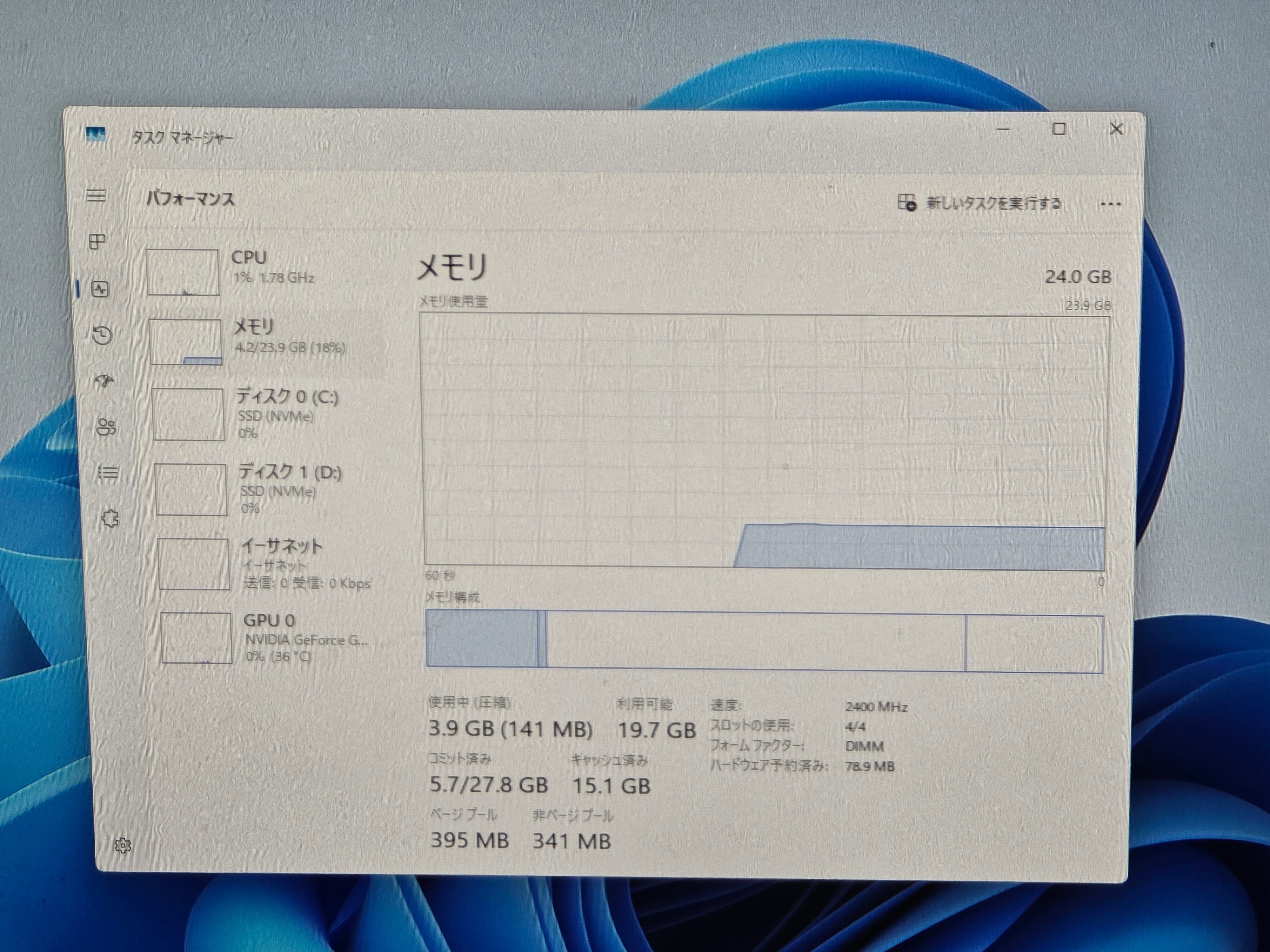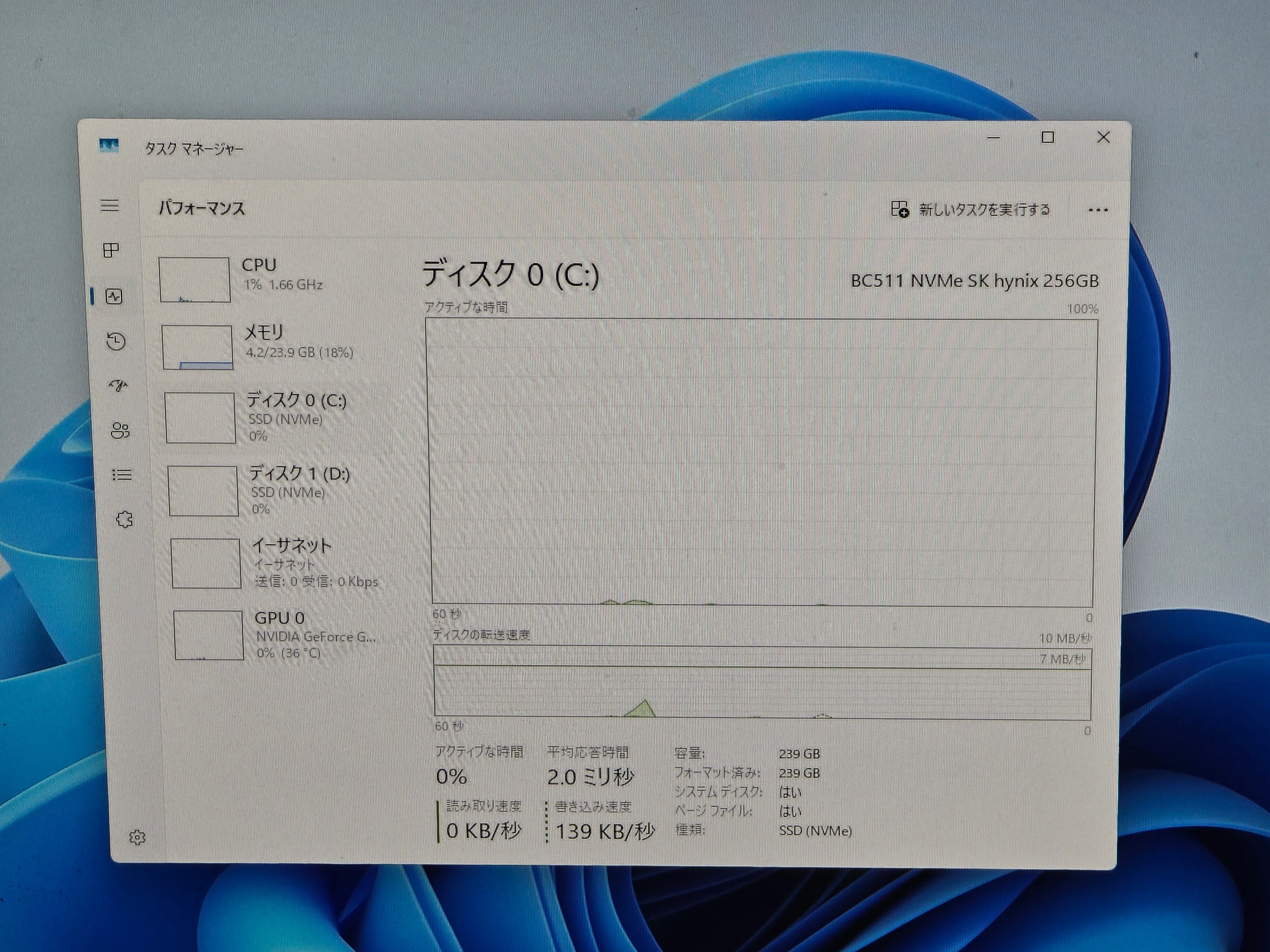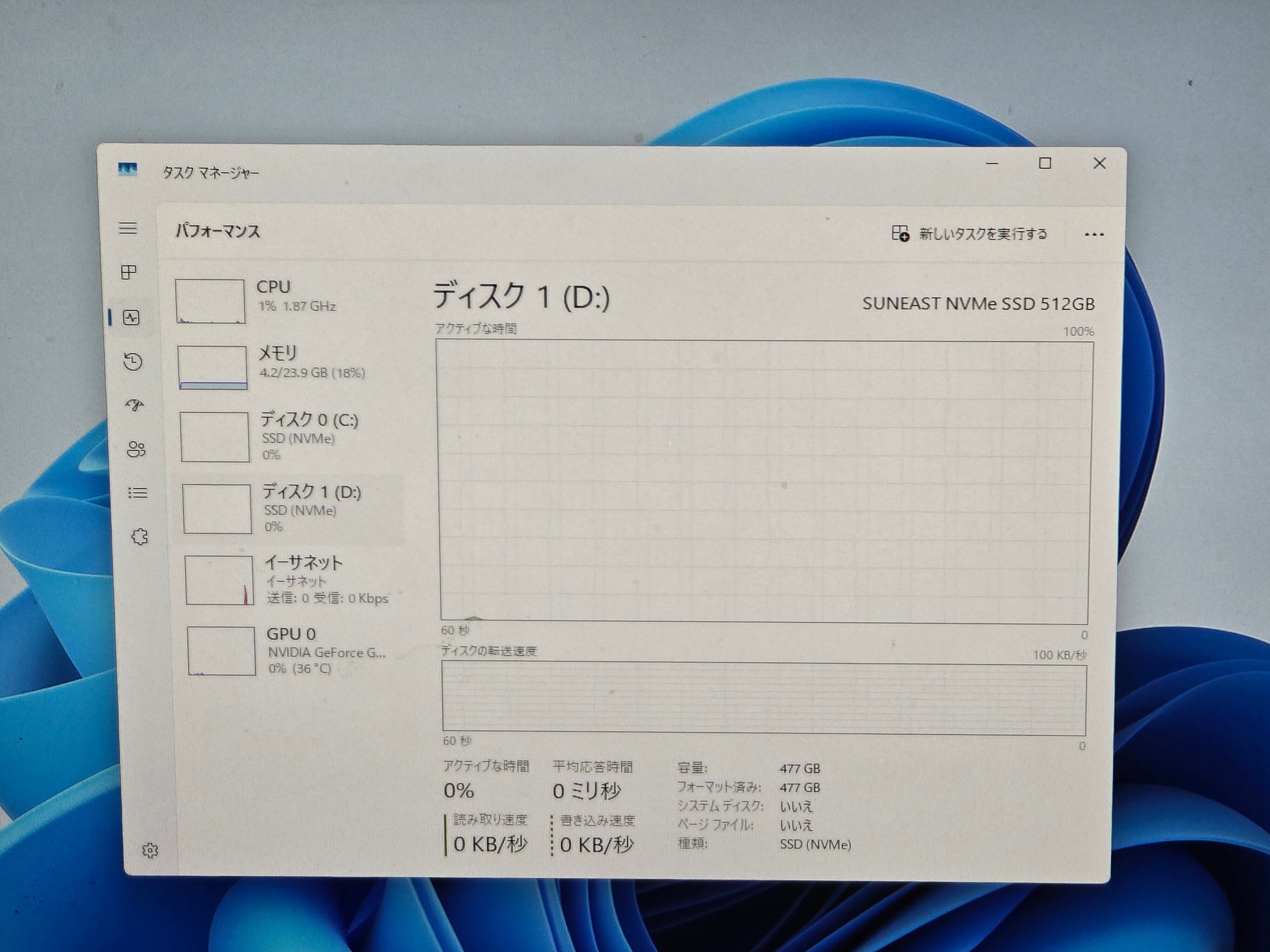 ・ストレージ:NVMe SSD 256GB(システム)+ 512GB(データ)合計768GB