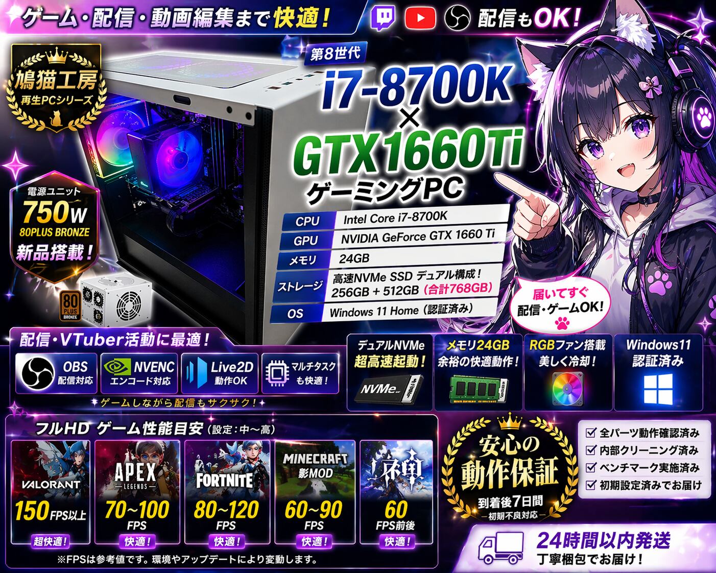 【鳩猫工房 再生PC】i7-8700K GTX1660Ti / 24GB / NVMe 256GB+512GB / VTuber配信対応 OBS・NVENC・Live2D動作OK